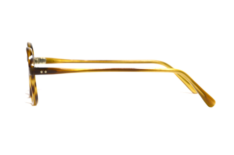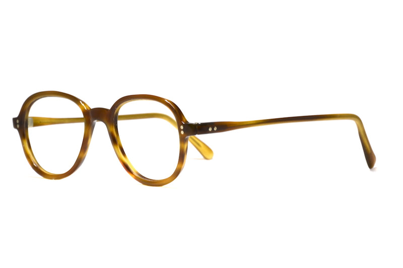 Golden mottle 1940s panto frame in a polished finish. This classic style is in excellent vintage condition and features silver pin head rivets to the temporal front and sides. A gorgeous original vintage frame not to be missed.