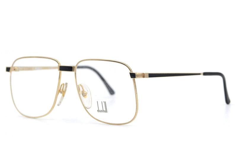New old stock Dunhill 6099 vintage glasses in colour 49. This particular model is 14KT gold filled. Gold filled frames are superior to gold plated frames and demonstrates the high quality materials and manufacturing techniques used to create this attractive frame. Manufactured in 1990. Dunhill 6099 is an oversized metal frame in gold with black Chinese lacquered inserts on the bridge and temporal sides. It's subtle yet distinguished and creates a stylish overall look. The lenses taper out, so they appear slightly wider at the bottom. The Dunhill emblem is visible on the temporal sides. These stylish, high quality vintage glasses reflect the essence of the British luxury brand which supplies exclusive menswear and accessories for the discerning gentleman.