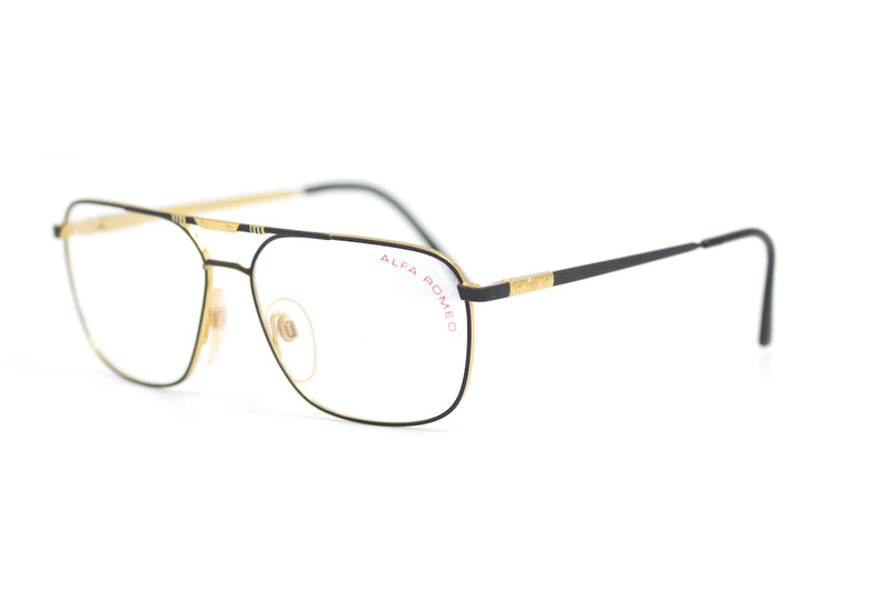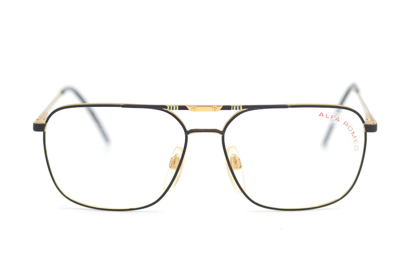 Check out this rare 80s vintage frame from Alfa Romeo. Model 124 in colour 604 is a gold metal frame with matte black paintwork with blue and green striped detail to the bridge. Manufactured in in Italy. The temporal sides feature the Alfa Romeo emblem. You could customise this frame to create amazing glasses or sunglasses.