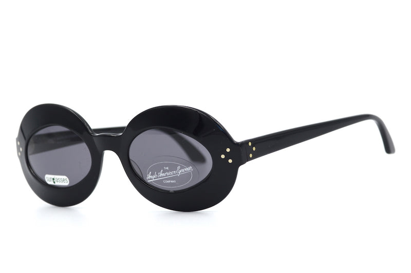 New old stock, Anglo American Eyewear Russell in solid black . This original vintage sunglasses frame is a fabulous oval shape, and features a broad lens surround with rivet detailing to the front and temporals sides. A seven barrel hinge adds strength durability to this high quality vintage frame. True 60s style sunglasses. The lenses are of high optical quality, grey in colour, absorb approximately 85% of light and most importantly have 100% UV protection. Super stylish original vintage sunglasses at Retro Spectacle. Original tags and suitable for Custom lenses. Available in three colours.