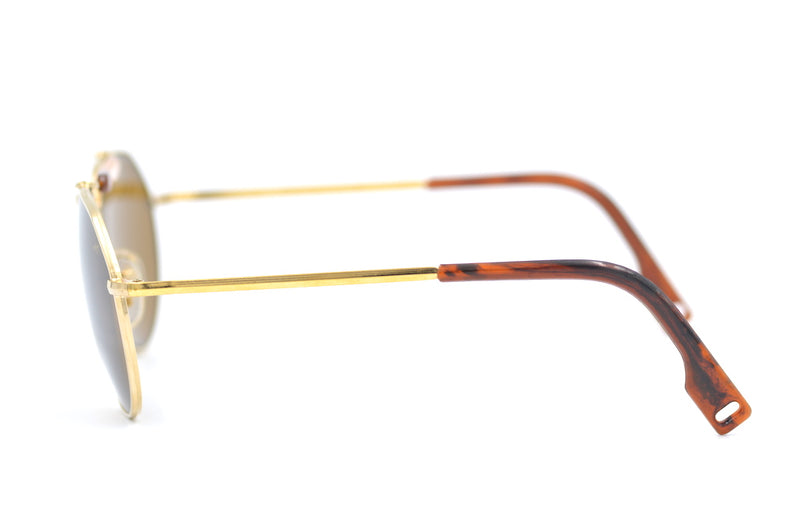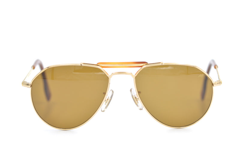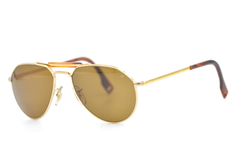 New old stock American Optical Skymaster Aviator Sport sunglasses in gold metal. A classic aviator shape with a double bridge for added strength and style. A similar style to those worn in Top Gun Maverick. It was in 1938 that the Army Air Corps in the USA needed a sunglass that would provide comfort, quality optics and protect pilots from blinding glare. Skymaster sunglasses met the test. Manufactured in the USA. The lenses are brown in colour, made of glass and have 100% UV protection. The left lens has the AO signature in gold. The frame comes with the original case. Custom lenses available with this frame.