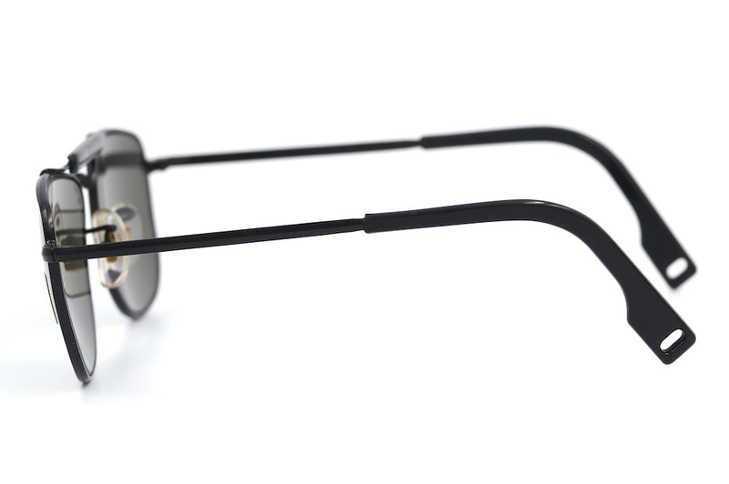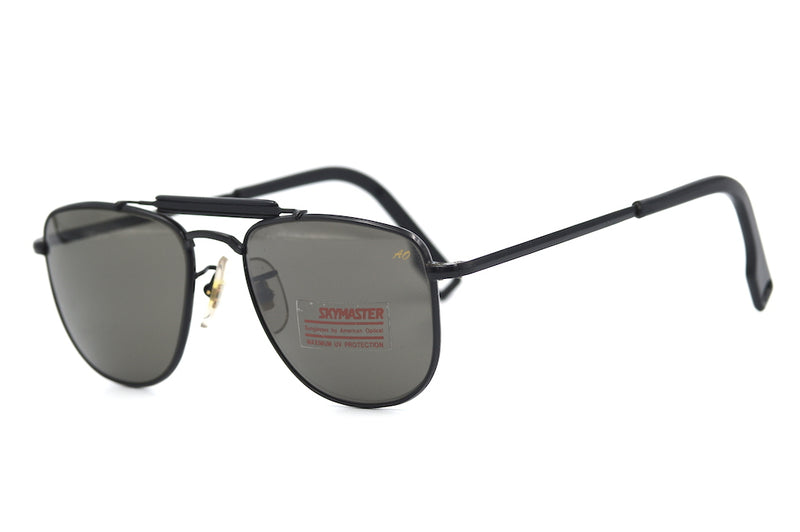 New old stock American Optical Skymaster Pilot Sport sunglasses in black metal. It was in 1938 that the Army Air Corps in the USA needed a sunglass that would provide comfort, quality optics and protect pilots from blinding glare. Skymaster sunglasses met the test. Manufactured in the USA. The lenses are grey in colour, made of glass and have 100% UV protection. The left lens has the AO signature in gold. The difference between the Skymaster Pilot and the Skymaster Pilot Sport is the thicker brow bar The frame comes with the original case. Custom lenses available with this frame.