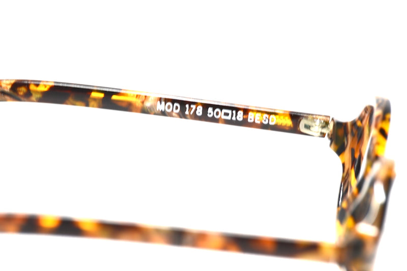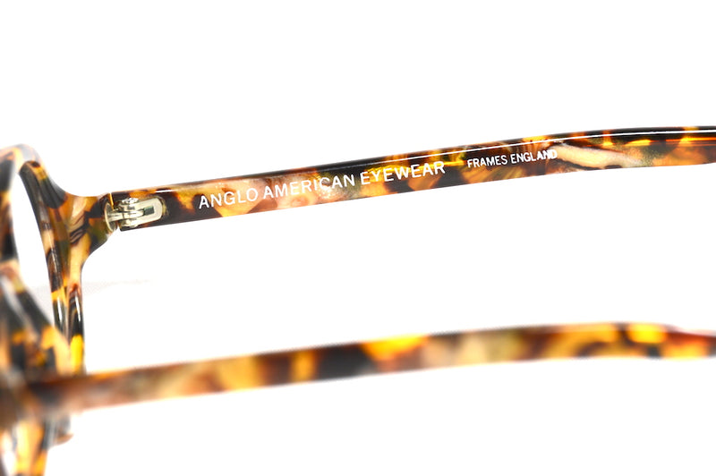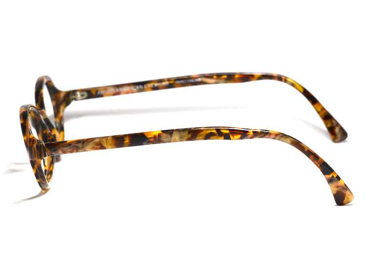 Original vintage Anglo American 178 BESD, made in England. Rare and hard to come across, this gorgeous oval acetate frame has a wonderful mottled acetate in a gloss finish. A variety of browns, ambers and cream run through this frame with a light gold shimmer in places. The vintage styling of this frame is still on trend, and this frame is in excellent vintage condition, showing little sign of wear. The frame is very striking despite it's simplicity, one not to be missed. Despite the small eye size of this frame, the frame is still a generous size, with this distance across the inside front of the frame measuring 130mm. Anglo American Optical Company Ltd was founded in London in 1882, this makes them incredibly popular and the brand is full of heritage. The frame is in good vintage condition with wear to the inside end tips. The outside of the frame in in great condition with only minor surface wear. This frame is incredibly wearable, a generous size and very fashionable.