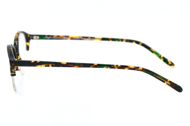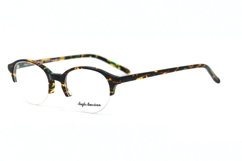Anglo American Eyewear 288A in colour TOWG. This green and brown mottled acetate frame is new old stock. The lenses are supported by a nylon cord, and it is with this in mind that we recommend if purchasing lenses to opt for our Super Strong lenses. These lenses are super strong and come with a two year anti breakage warranty, which prevents the exposed lenses from chipping. The lenses also come with UV protection as standard.