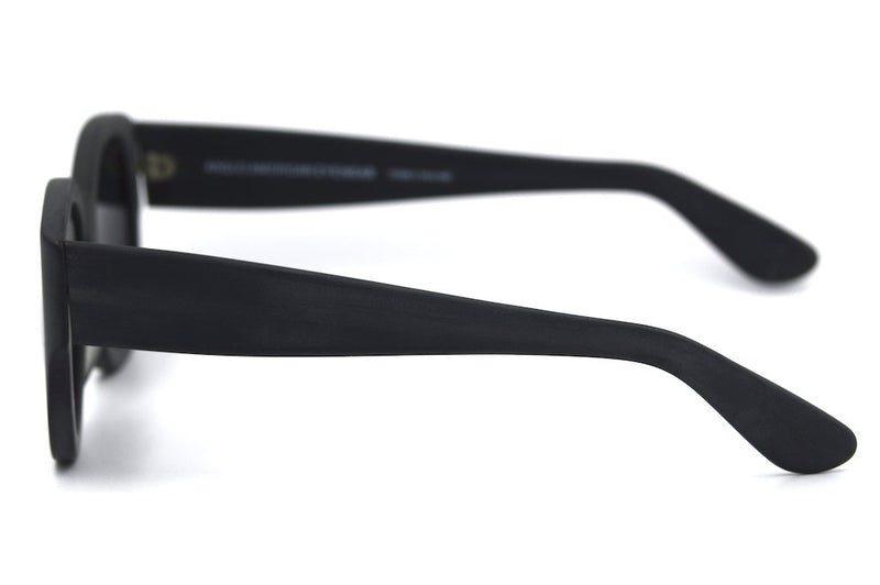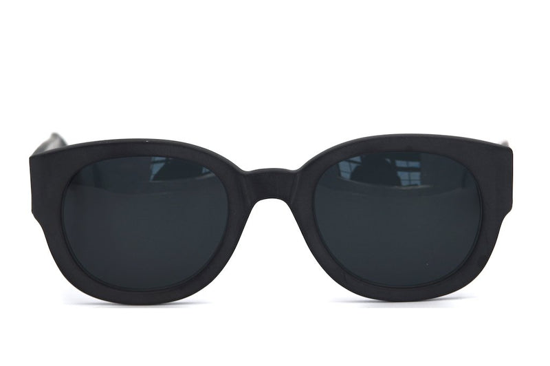 New old stock, Anglo American Eyewear 723 in matte black with a dusty grey finish. This bold and chunky acetate frame packs a lot of punch with broad temple sides and dark grey lenses, absorbing approximately 90% of light. The lenses have 100% UV protection. Stylish frames, suitable for Custom lenses.