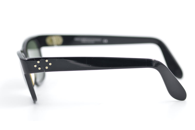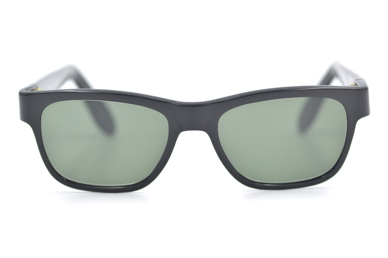 Anglo American Eyewear Baker is a classic vintage sunglasses frame packed with style. This black acetate frame features a wrapped temporal joint, with a seven charnier hinge and six silver pin head rivets each side. Manufactured in England, this frame is a crowd pleaser, perfect for someone wanting a strong bold look. G15 green lenses provide 100% UV protection.