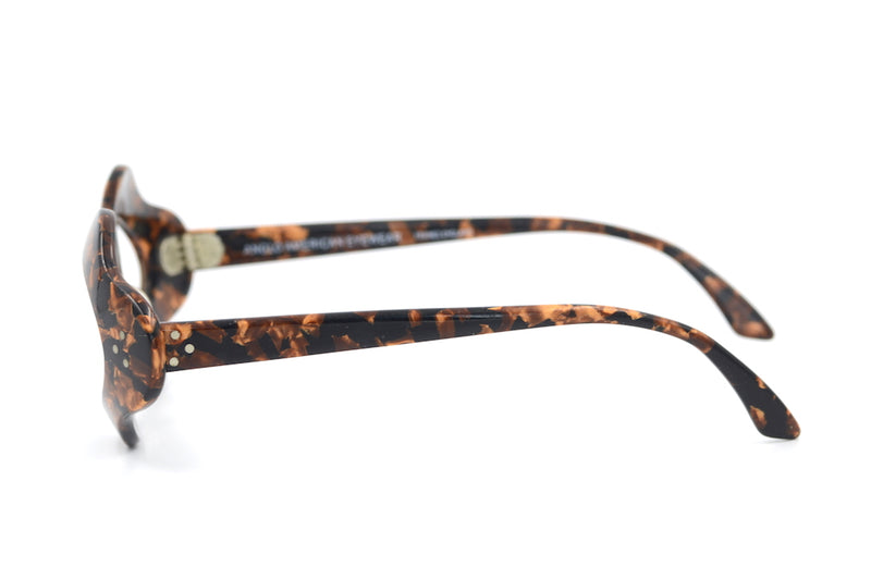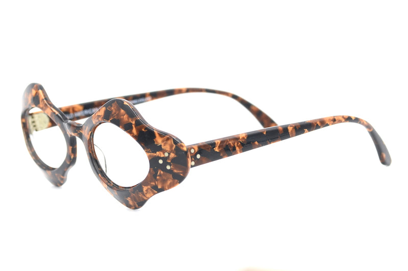 Super rare Anglo American Eyewear Greer frames. Beautiful brown and black marbled acetate is transformed into this unusual, spectacular shape. This frame has been manufactured in England . The front and temple sides feature silver pin head rivets and a seven barrel joint supports the temple sides. The right temple sides features a small silver emblem, which looks like a cross between a G and a pair of spectacles. A fashionable, functional, collectors frame, new old stock.