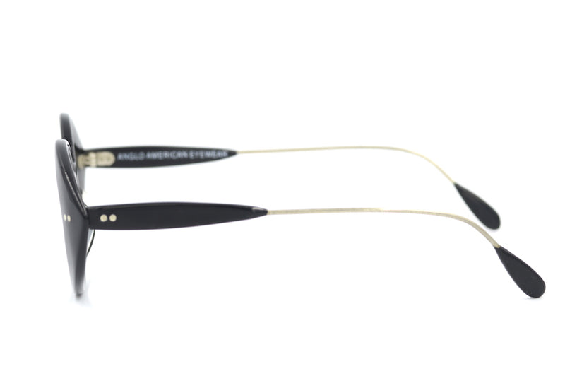 Anglo American Eyewear Hopper in BLK. This new old stock frame manufactured in England. This fabulous unusual shape features silver pin head rivets to the front and temple sides. The temples are a combination of black acetate and fine silver metal. This frame looks fabulous as spectacles but could easily be converted into Custom sunglasses. A feminine, soft shape with an edgy look. Not to be missed. Custom lenses available from £29.00.