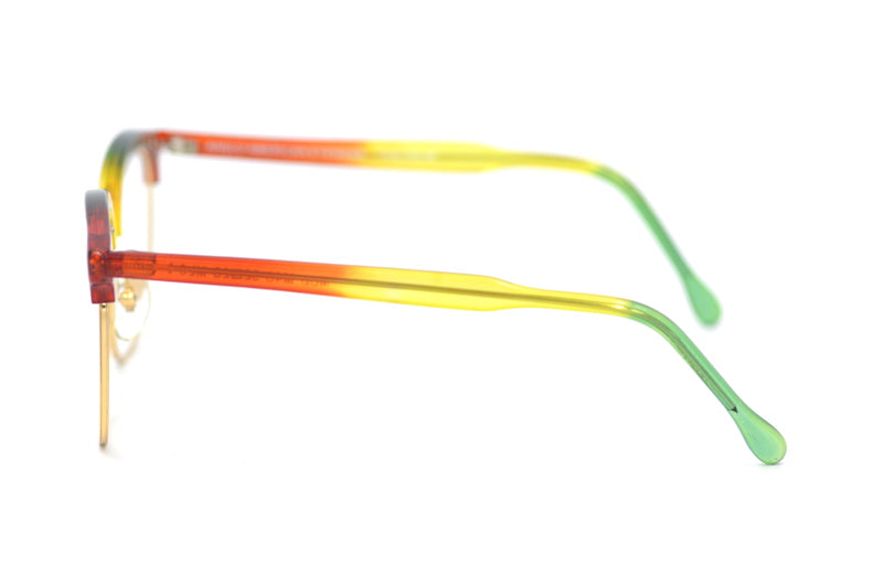 Anglo American Eyewear M40 in colour MLC1. This brow-line combination frame features polished gold metal rims, which house multi-coloured mottled acetate covers and matching temporal sides. This unisex frame channels Malcom X style glasses.