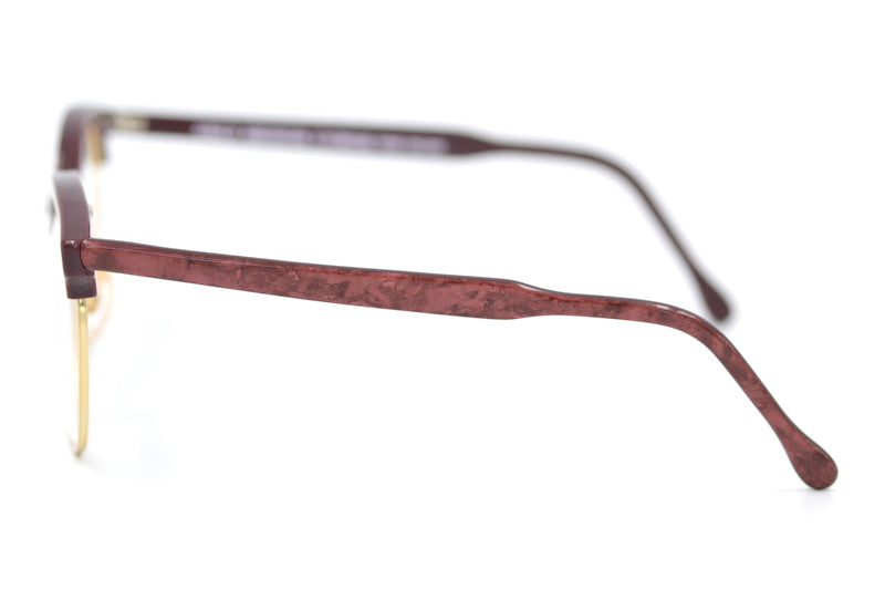 Anglo American Eyewear M40 in colour WIST. This brow-line combination frame features polished gold metal rims, which feature brown mottled acetate covers and matching temporal sides. This unisex frame channels Malcom X style glasses. Available in other colours.