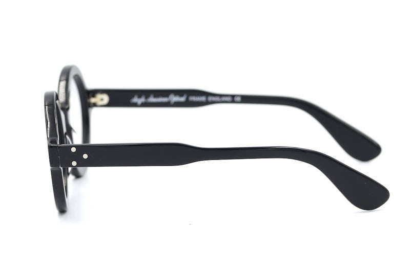 Anglo American Optical 180E in TOSH black polished acetate. This frame is full of character and despite being a modern frame, it is heavily styled on vintage frames. The round acetate frame features thick rims, for a bold look. Three pin head rivets can be seen to the front temporal edges and sides. Simplistic yet a statement frame not to be missed. Prescription lenses available from £29.00.