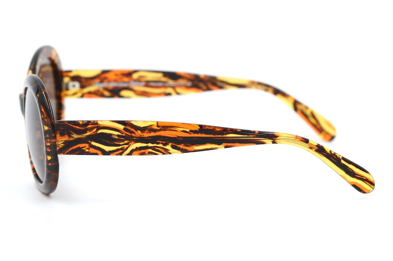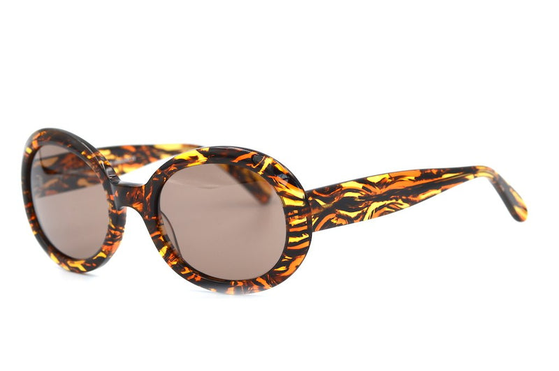 New old stock, Anglo American Optical Aurora in colour TOWO. This oval shaped acetate frame has the most fabulous amber mottled effect. The temples are mid set giving great shape to this frame. The lenses are brown, absorb approximately 85% of light and have 100% UVA and UVB protection. A super stylish frame, which is also suitable for Custom sunglasses.