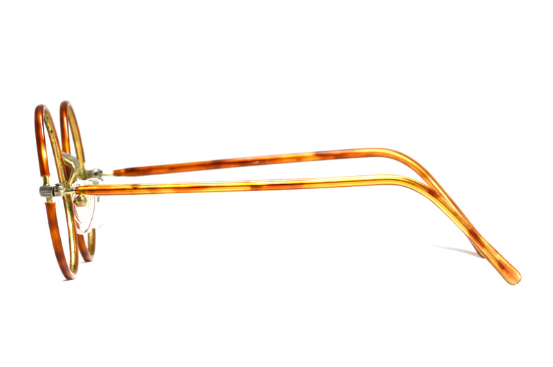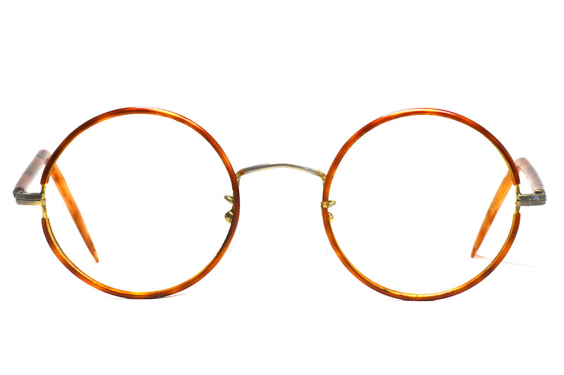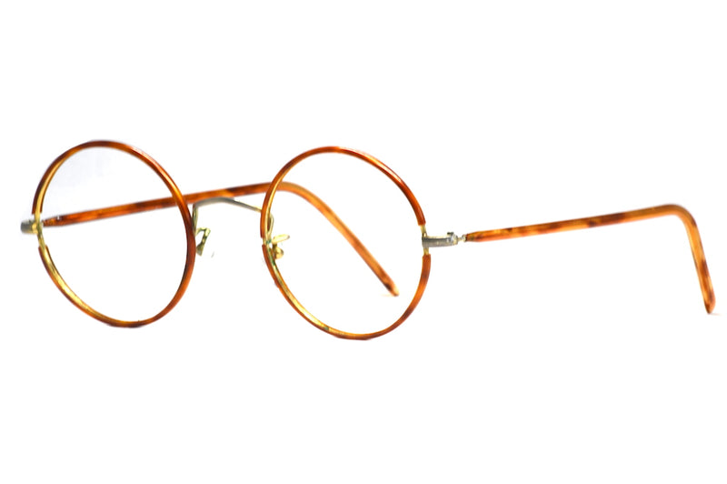 Original vintage Anglo American Eyewear round frame with acetate rim covers and temples. This oversized round frame features amber coverings which create a strong vintage feel. The frame is in good vintage condition but the metal has tarnished making it appear more silver than gold. Structurally the frame is in great condition ready to house new prescription lenses.