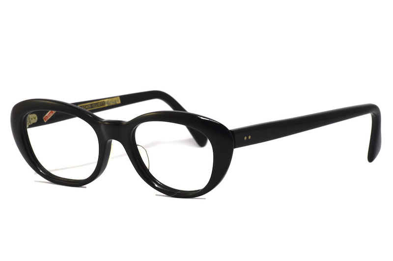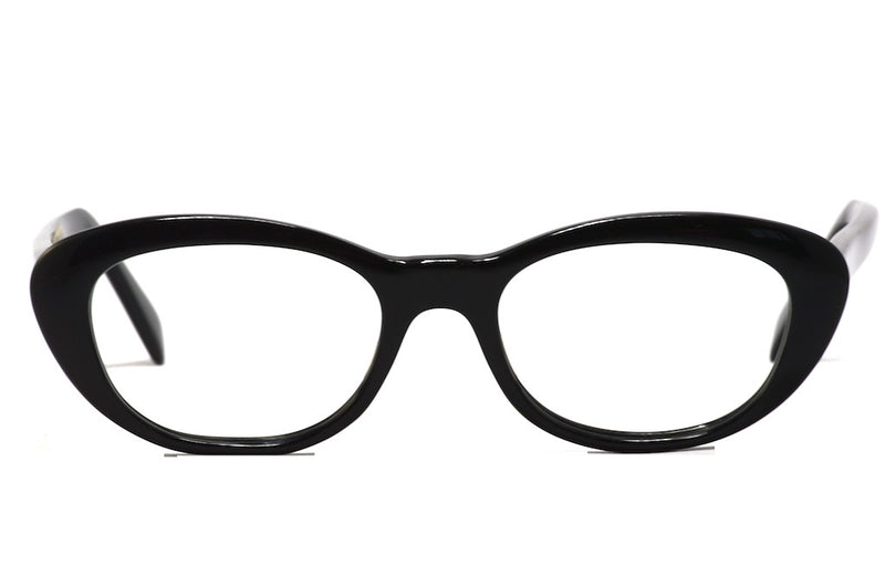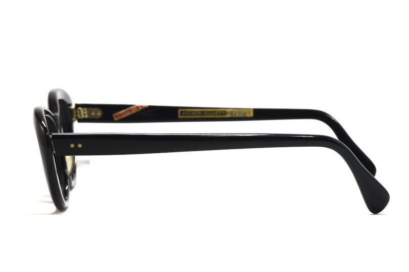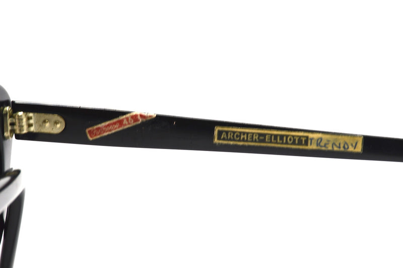 - Here we have a pair of orignal 1950's vintage cat eye glasses. Filled with heritage, the frame features the original stickers on the inside left with the words "Archer Elliott - Trendy" on. The black aceate creates a powerful and strong look. Two silver pin head rivets can be seen to the sides. The sides are supported by a 5 barrel joint adding great strength and support. The frame is in excellent vintage condition with minor surface scratches and features a fixed pad bridge.