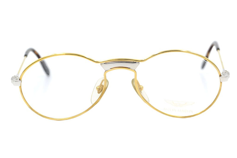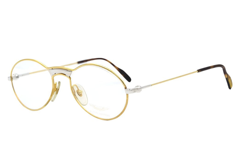 We just love this new old stock Aston Martin 001 men's vintage glasses frame. Aston Martin are known for luxury, high quality cars, and the vintage glasses are no exception. Manufactured in the 1990's by August Wulf in Bad Salzuflen, Germany. The frames were limited and the unique frame number is present on the inside bridge. The temporal hinge, has been engineered to resemble a gear stick, with the spherical hinge construction. The left temple tip features the word Aston Martin whilst the right features the iconic Aston Martin emblem. The frame has a polished gold finish with silver detail to the bridge and temporal sides. Custom lenses available from only £29.00.