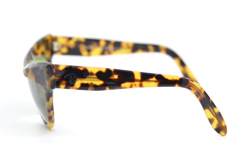 B&L RayBan Onyx in colour WO 806. This rare vintage frame from the 80s is a bold and striking model. The thick brown tortoiseshell acetate makes a stunning pair of cat eye sunglasses and features a matte finish to the front, whilst the sides are polished . The left temporal side has a subtle RayBan signature. Manufactured in France. Original green glass lenses are fitted which have the B&L etchings. The RayBan signature is slightly worn but is only visible on close inspection anyhow. This has been reflected in the price.
