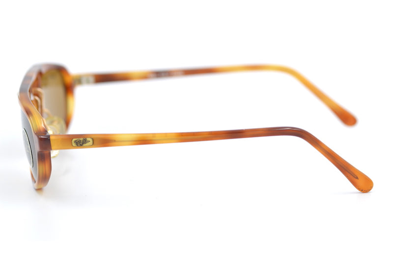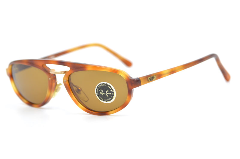 • B&L RayBan Premier B W1375 vintage sunglasses. Manufactured in the early 90s this new old stock frame comes fitted with the original brown glass Bausch & Lomb RayBan lenses. The lenses feature both the B&L and the RayBan signatures. The warm brown mottled acetate features an antique brass RayBan plaque on the left temporal side. The gold metal double bridge is a stylish touch to this rare new old stock frame.