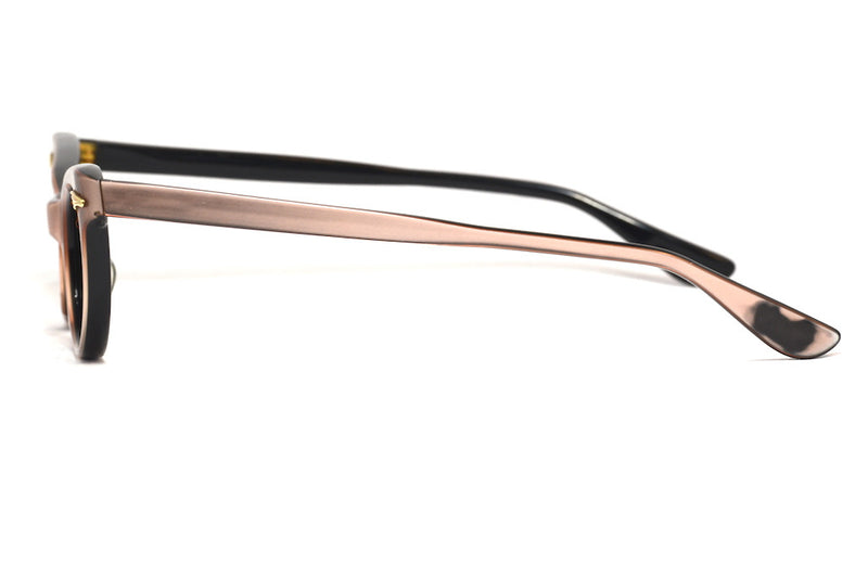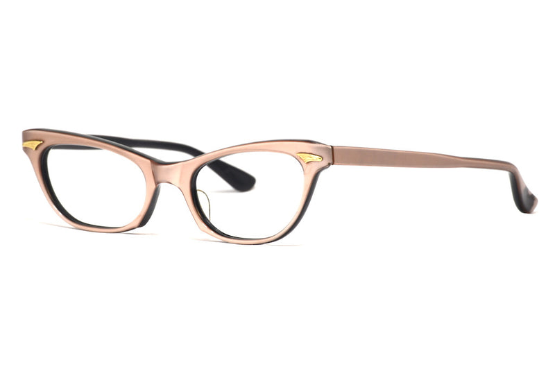 Vintage cat eye 1960’s baby pink glasses. The beautiful dusty pink acetate features gold fan details to the upper temples at the front. Five charniers support the sides, and the frame features original stickers on the inside with the numbers “24.95 45-64”. The frame is in used vintage condition and the acetate has discoloured at the temple tips (as seen in the images), however the tips are hidden behind your ears so still very wearable. The sides splay making it wider at the ear point, so could be worn by someone with a slightly wider face.