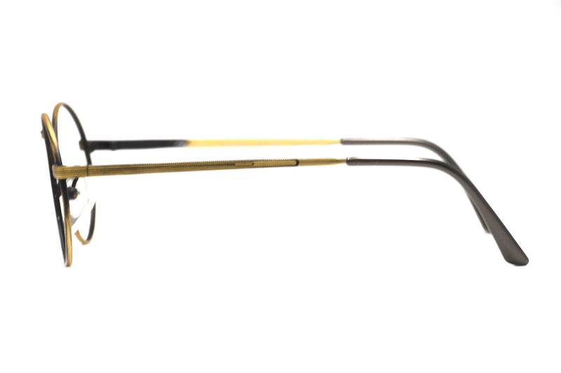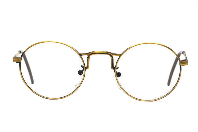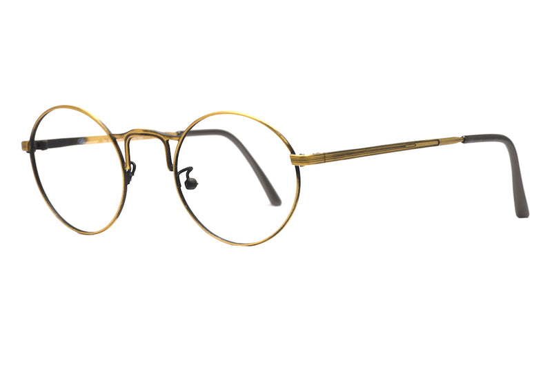 BM 16 is a new old stock antique gold round metal frame. The key features on this frame are the unusual and detailed bridge, and fine detailed temple sides. A classic shape and popular design, this frame is in excellent vintage condition.