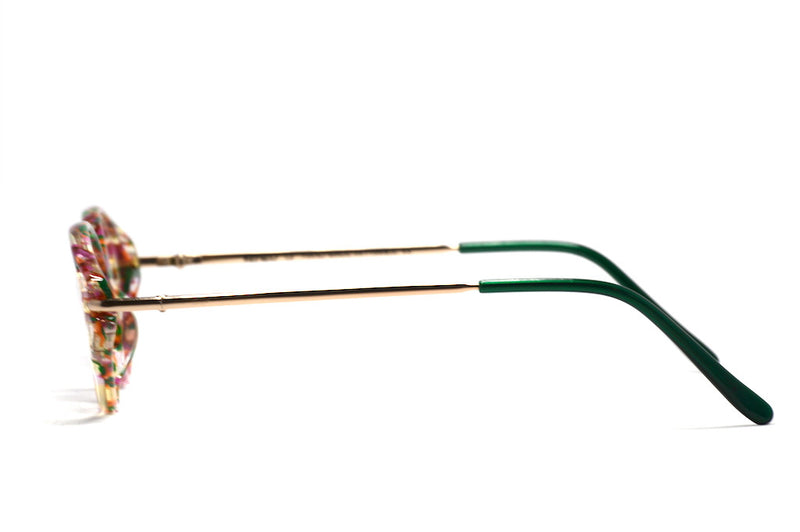 **Brand New** Ladies Pompeu frame by Kenzo. Hand made in France this 1980's style acetate frame has a pink, green and crystal acetate front, accompanied by fine gold sides and green temple tips. On the left side a very subtle Kenzo signature can be seen. Kenzo was founded in 1970 by a Japanese man called Kenzo Takada in France, and it remains to this day a luxury fashion house.