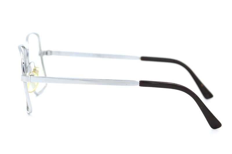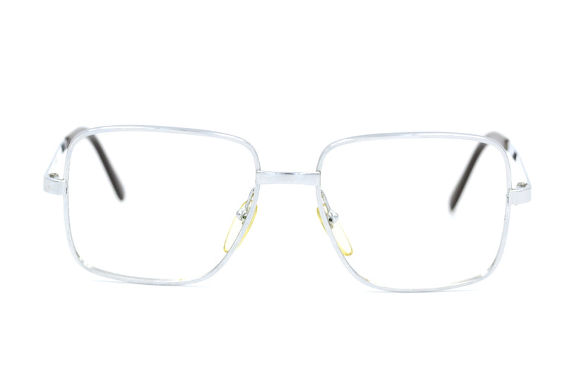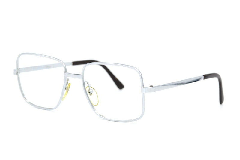 In excellent vintage condition, showing little sign of wear, we have Bruno. This square, silver polished metal vintage glasses frame was manufactured in France. A stylish, high quality frame not to be missed. Prescription lenses available from £29.00. Lens Width: 52mm Lens Depth: 44mm Bridge Width: 20mm Temple Width: 132mm Temple Length: 140mm