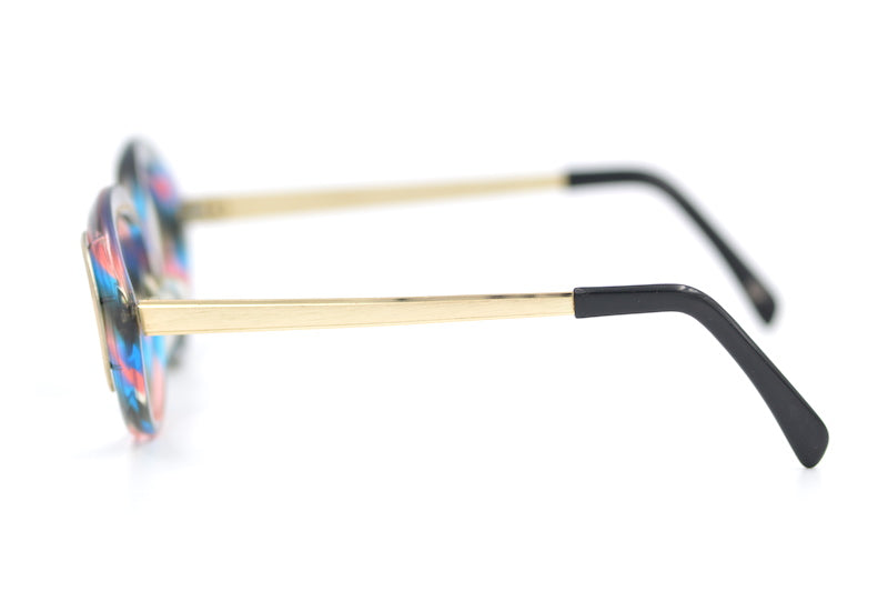 Carly is a new unused vintage glasses frame from the 50s. This stunning combination frame features a pink and blue mottled front with brush gold sides, and front edge detail. A stunning frame, in a generous size for the decade. Suitable for most prescriptions. Shop the best selection of vintage eyewear at Retro Spectacle.