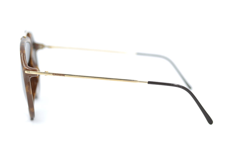 Carrera 5327 12 oversized aviator, vintage sunglasses. Manufactured in Austria in the 80s. A really cool brown mottle front, balanced beautifully with fine gold metal temples. The left lens and. temporal sides feature the Carrera signature. Brown graduated lenses provide 100% UV protection. Sustainable, stylish sunglasses from the 80s.