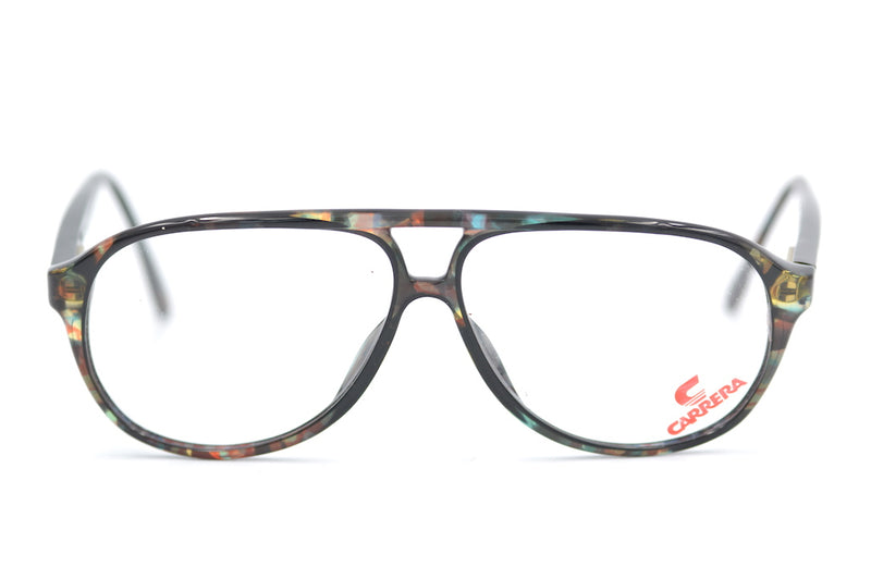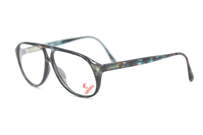 New old stock Carrera 5390 vintage aviators in colour 93. Manufactured in Austria in the 80's this high quality frame is made of Optyl, a lightweight, durable and hypoallergenic material. The mottled effect has hints of different colours running through, with blue highlights. The frame is unisex and would be considered as a small gent's/medium ladies size. A classic design, that would look great as Custom glasses or sunglasses. The Carrera signature is present on the temporal sides.