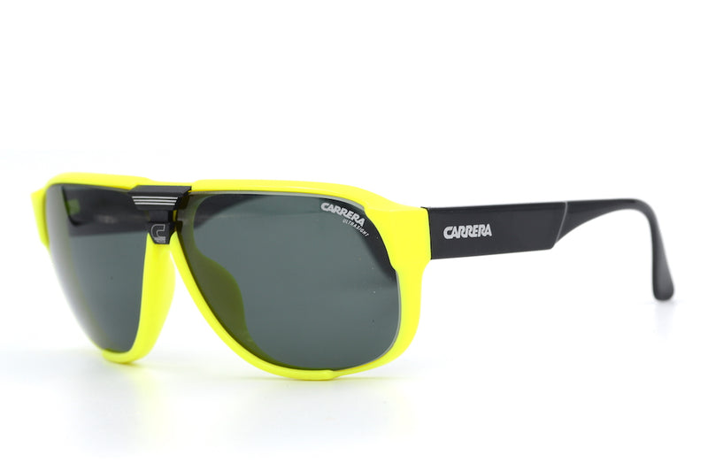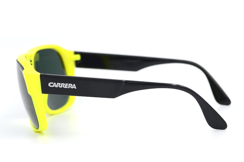 New old stock Carrera 5431 in colour 40. The ultimate Apres Ski vintage sunglasses. Manufactured in Austria in 1988, these neon yellow sunglasses are just so fun. The temporal sides are black and feature the Carrera signature in silver. Carrera lenses have C-Vision 400 protection, which offers 100% UV protection. Carrera was founded in Austria in 1956 by Wilhelm Anger.