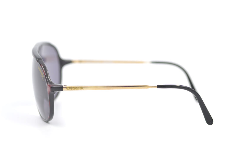 Carrera 5467 Panamericana in colour 31, rare vintage sunglasses. Manufactured in Austria, in the 90s. This rare Carrera design features the Champion logo on the bridge. Carrera Ultrapol grey lenses provide 100% UV protection, whilst eliminating glare with their polarisation properties. The front of the frame is made of carbon fibre, making it light and durable, the gold metal temporal sides feature the Carrera signature. New unused vintage frames from the 90s.