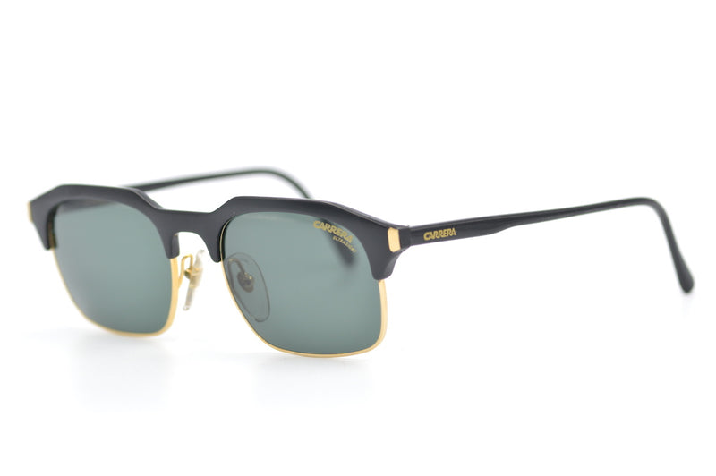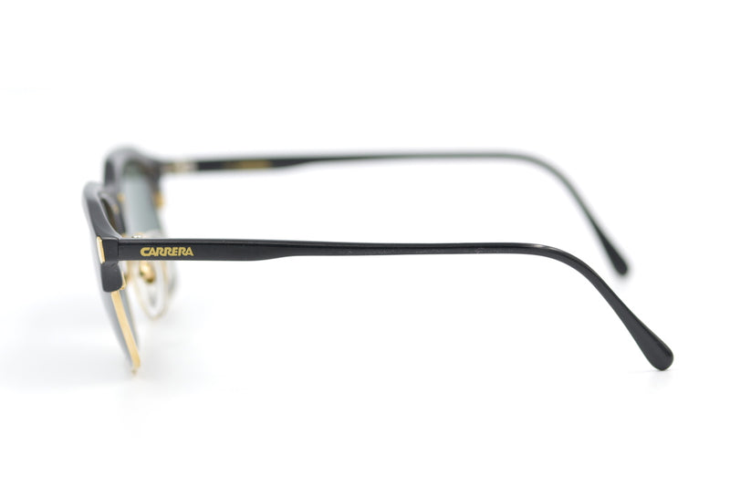 Carrera 5479 vintage sunglasses in colour 90. Manufactured in the mid 90s in Austria, this stylish frame has a real retro Mod feel to it. Gold metal rims are highligted with the contrasting black acetate brow and temporal sides. G15 Carrera ultrasight lenses provide 100% UV protection. Stylish sustainable sunglasses from the 90s, new unworn stock.