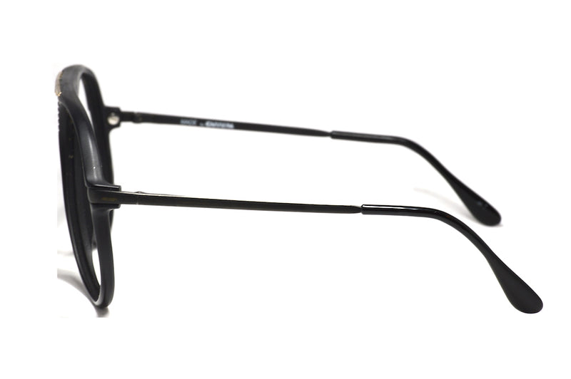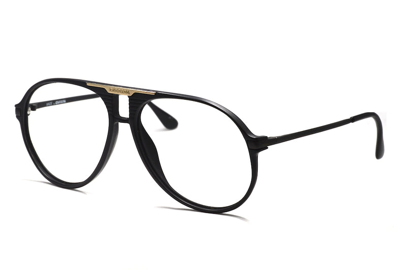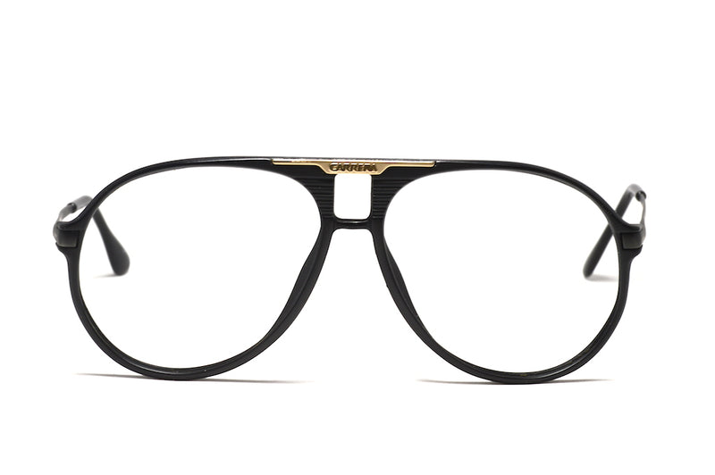 1980's Carrera 5595 vintage glasses. Manufactured in Germany in 1984. Worn by Nikki Lauda in the 80s. These beautiful frames have a matte black acetate front which is dominated by the nasal bridge detailing and gold Carrera plaque. The sides are matte black metal, slim, plain and create a good contrast to the front. This vintage Carrera aviator is in excellent vintage condition and would look great as spectacles or prescription sunglasses. We would recommend a G15 graduated tint for maximum style.