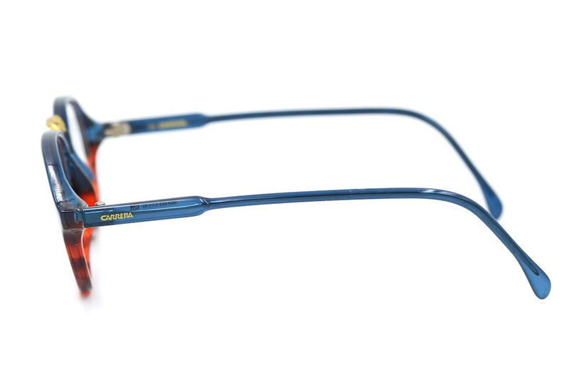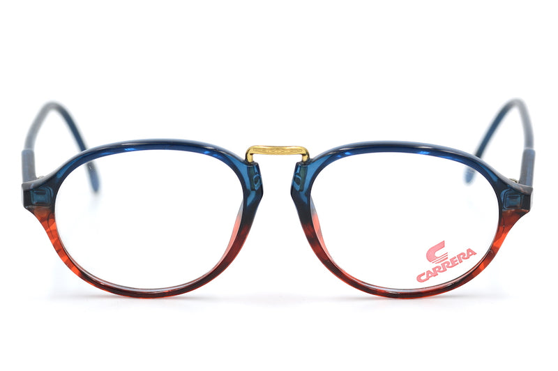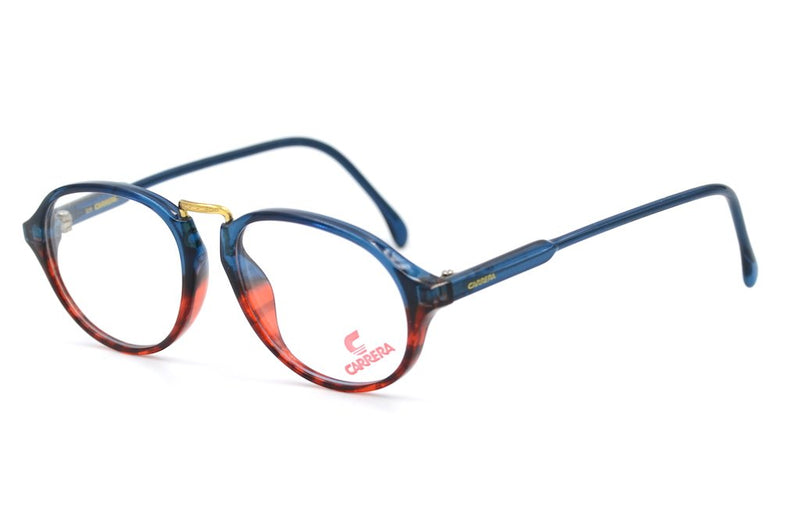 Carrera 5741 vintage glasses in colour 31. Manufactured in Austria, the frame is made from Optyl, a lightweight, hypoallergenic and durable material. The front of the frame fades from blue to red and a gold metal bridge with filigree detail is present. The temporal sides are mid set giving great height to the frame.