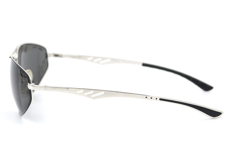 New old stock Carrera 7015/S vintage sunglasses in colour 6LA, silver metal. A very sporty pair of sunglasses, perfect for winter sports, the lenses are made of polycarbonate, an impact resistant material and have 100% UVA and UVB protection. The lenses are grey and absorb approximately 85% of light. The temporal sides offer a skull grip fit, perfect to be worn under helmets and hats. The lenses are curved, which also offers good peripheral protection from the sun. The frames are in superb condition, minor blemishes from storage are on the lenses, but these do not in anyway affect the wearability of this frame.