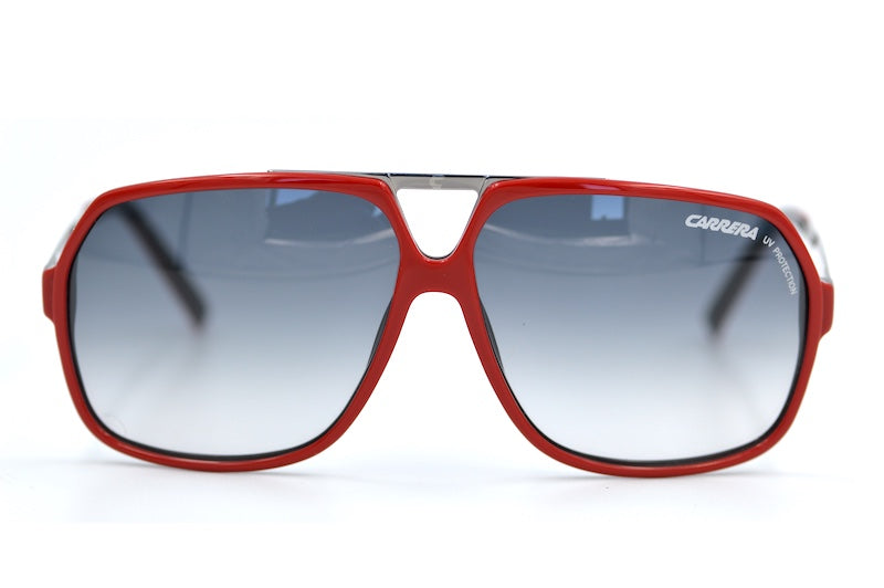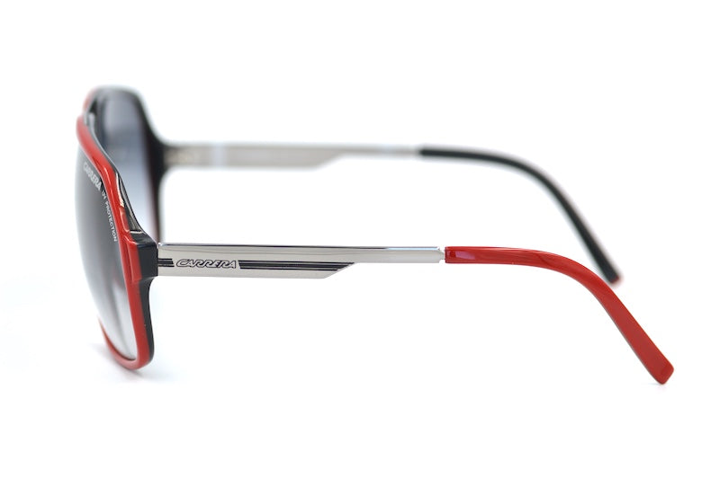 Carrera Drift red aviator sunglasses. This combination frame features a striking red front with silver metal sides. The sides feature the Carrera signature as does the left lens. The Carrera emblem can also be seen on the metal double bridge. Grey graduated lenses provide 100% UV protection. Get your F1 sunglasses with vintage Carrera.