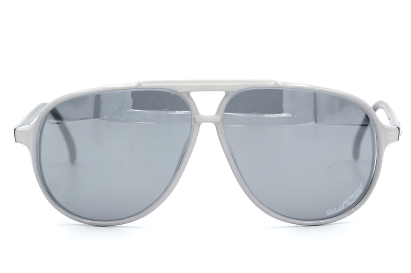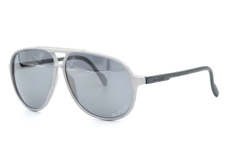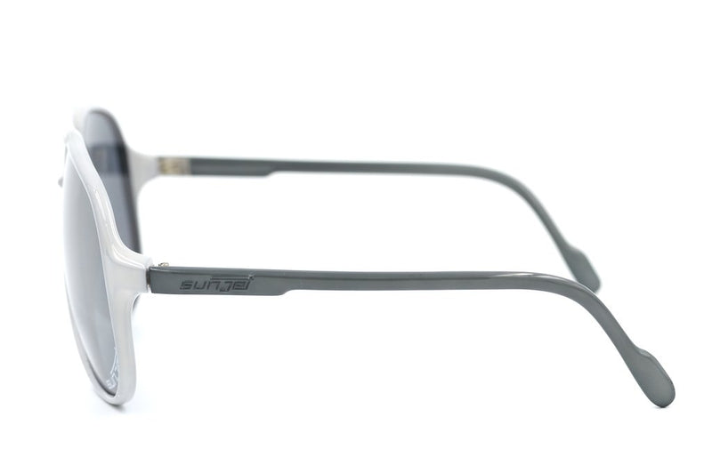 New old stock Carrera Sunjet 5241 vintage sunglasses in colour 20. Carrera launched the Sunjet range in 1986. This frame was manufactured in Austria, a classic aviator style, which is lightweight and durable. The acetate frame is a light grey colour and has been matched with grey mirrored lenses which offer 100% UVA and UVB protection and absorb approximately 85% of light. The left lens features the Sunjet signature in white. The temporal sides are a darker shade of grey and also carry the Sunjet signature. A stylish frame perfect for the winter months. Carrera was founded in Austria in 1956 by Wilhelm Anger.