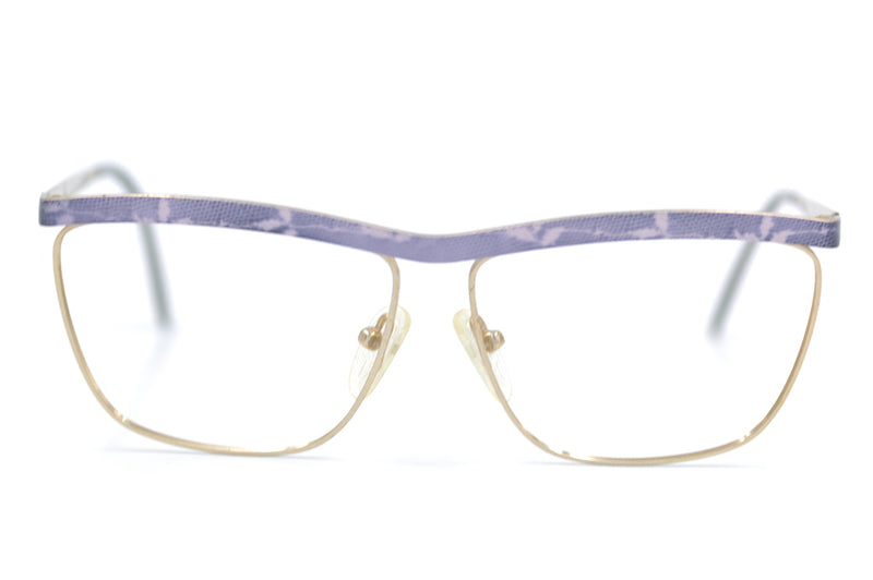 Casablanca oversized vintage frames from the 80s. This cool metal design is made of silver metal, and features a purple snake-print brow and side. Design similar to vintage Casanova frames. Oversized cool funky frames.