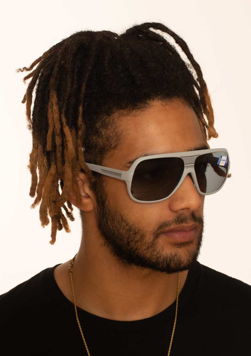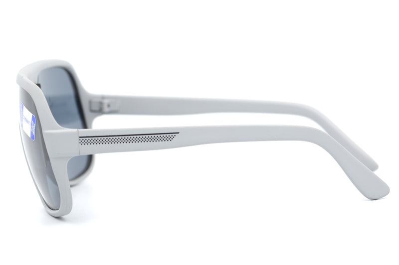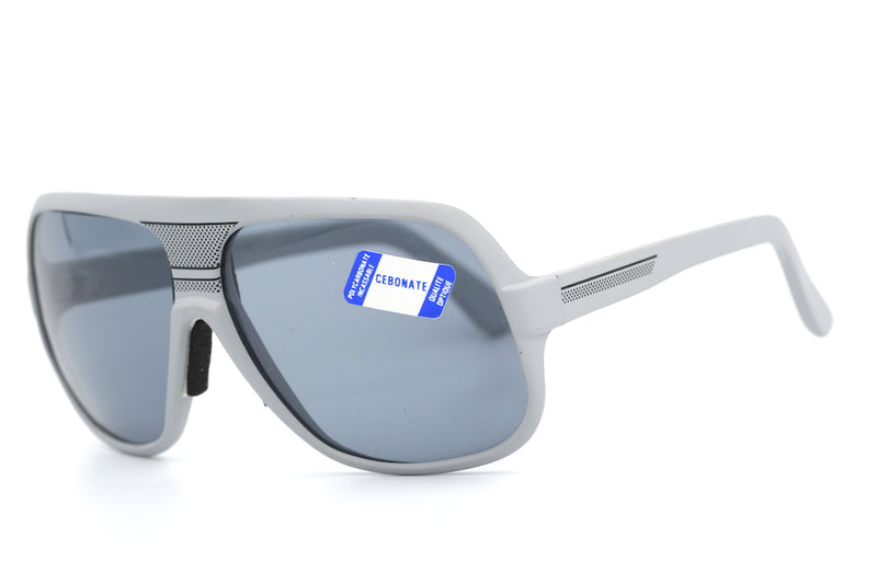 New old stock Cébé Gris vintage sunglasses. This high quality frame, manufactured in France has been fitted with grey polycarbonate lenses with 100% UV protection, perfect for the slopes or sporting activities. This matte grey frame has a rubberised feel with black painted detail to the bridge and temporal sides. Stylish sustainable sunglasses at Retro Spectacle.