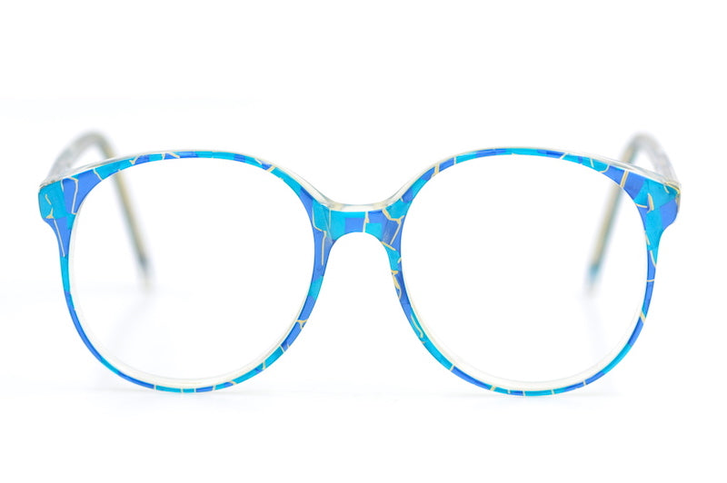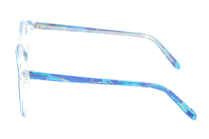 We're nut's about this oversized Chelsea frame in marine. Flecks of blue, turquoise and gold run through this acetate frame. This oversized 80s frame has been worn and is in good overall condition, however please note, there are two small cracks (one on each temporal side) where the bend starts on the ear, this has been reflected in the price. Chelsea frames were manufactured by Michael Selcott.
