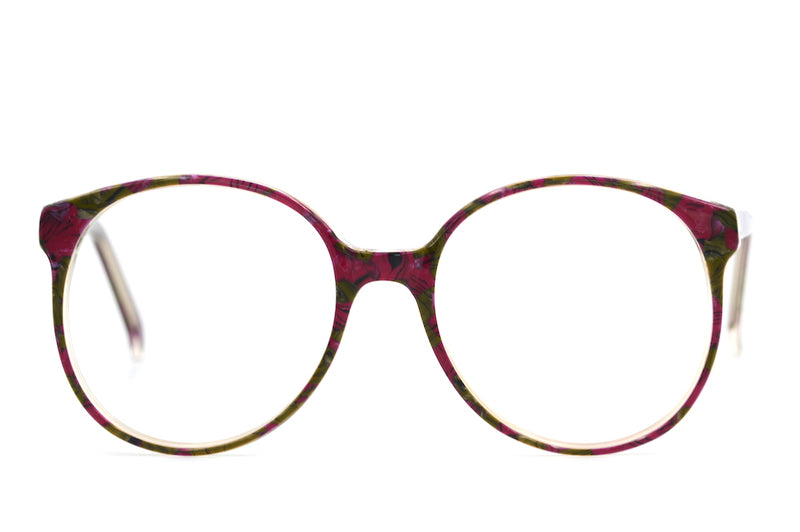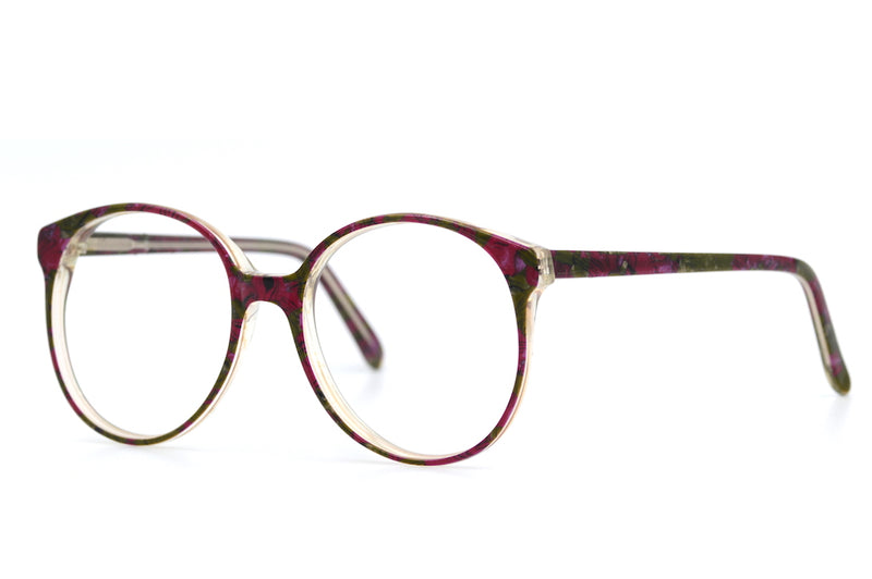 Chelsea is one of our most popular oversized vintage glasses frames from the 1980's. The model came in many different colours, but this model has a plum and green floral pattern. For an oversized frame the shape is quite easy to wear. This sustainable frame is in excellent condition with little sign of wear.