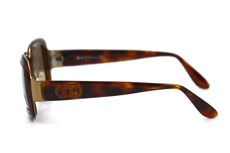 Original vintage new old stock from the 1980's, Christian Dior 2036 ladies vintage sunglasses in colour 11Q. This super funky combination frame features a polished bronze front rim, with black brown mottle inner rims and temporal sides. The Christian Dior emblem can be seen in polished bronze metal on the temporal sides. On trend and inline with the rebirth of the logo. A strong stylish frame, which will always remain cool. The lenses are brown, absorb approximately 85% of light and offer 100% UVA and UVB protection.