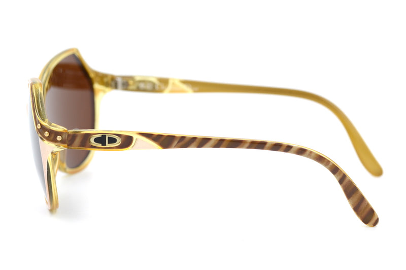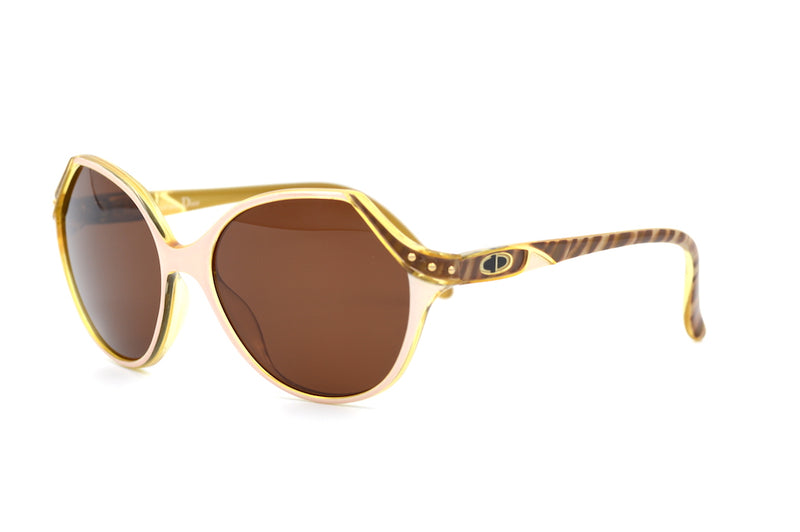 Oversized in shape but a nice neat fit, we have this original 1908's Christian Dior 2297 in colour 11. Manufactured in Germany the frame has been made to the highest quality. The material is Optyl, which is lightweight, durable and hypoallergenic. The lenses are new, absorb 85% of light and have UV400 protection. The front of the frame is light pink with gold stud detailing to the temporal edge. The temporal sides have the Christian Dior emblem and and a beautifully brown mottled side. Perfect for those who require prescription sunglass lenses, which can be fitted on request.