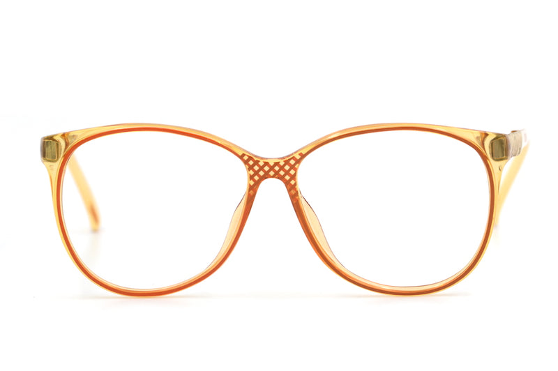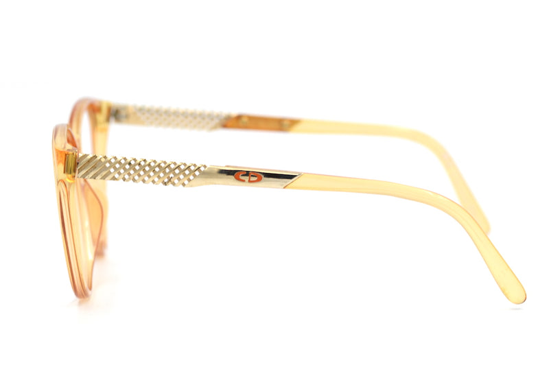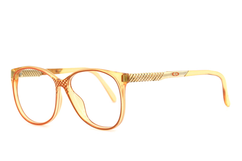 Christian Dior 2334 vintage glasses in colour 41. Manufactured in Germany, this up-cycled frame is in excellent condition. Made of Optyl the frame is lightweight, durable and hypoallergenic. Orange detail adorns the front with the temporal sides featuring the Christian Dior emblem in orange on a gold metal plate. Sustainable, stylish eyewear.