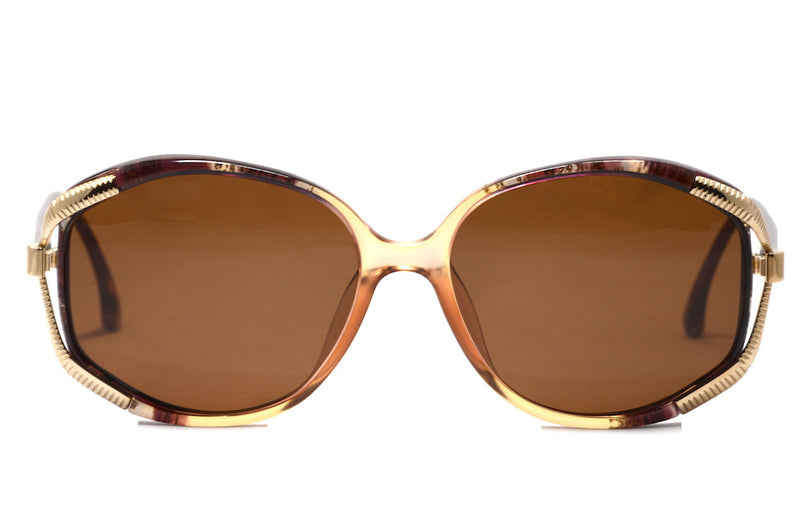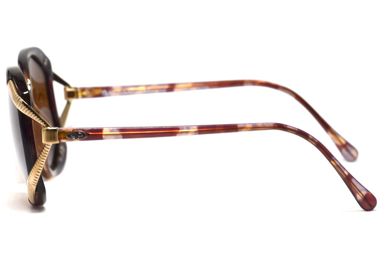 Christian Dior 2090 colour 80 1980's bespoke vintage sunglasses. We have customised these stunning Christian Dior frames fitting brand new optical lenses with full UV protection and a brown tint 85% abs, creating a unique and stylish pair of sunglasses. This frame is made out of Optyl which is a very light weight material. The aubergine motteled aceate coulour stands off from the light brown nasal bridge. Gold detailing joins the front to the sides, and the Christian Dior emblem can be seen at the front of either side. Made in Germany this is a gorgeous oversized sunspec which is in excellent vintage condition.