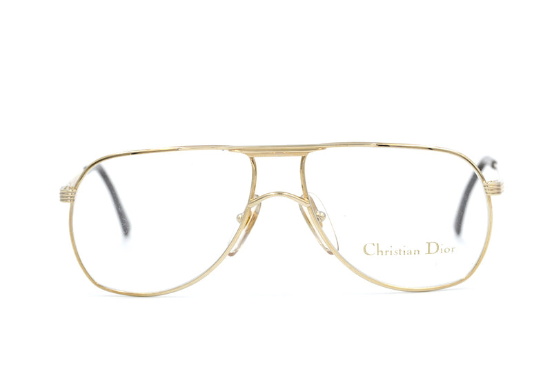 New old stock Christian Dior 2553 vintage glasses in colour 40. This vintage aviator frame is made of polished gold metal and was manufactured in Germany. The frame features a double bar bridge for strength & style, adjustable toggle pads for further adjustment. The temporal sides feature the Christian Dior emblem. Stylish and sustainable Christian Dior glasses from the 80's.