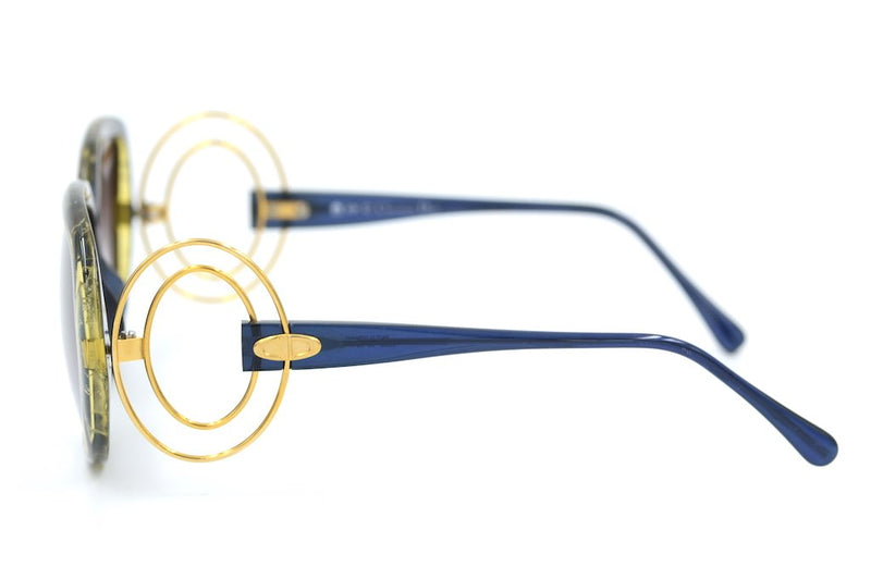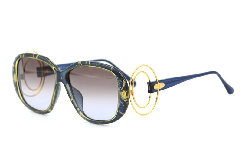 Christian Dior 2558 vintage sunglasses in colour 50. This orignal women's Dior sunglasses frame is in superb condition. The frame is made of Optyl, a lightweight, durable and hypoallergenic material. The frame is blue with flecks of glittering gold throughout. The most striking feature of this frame is the gold circular detail at the temple edge , which feeds through the Christian Dior emblem. The lenses are brown graduated and offer 100% UV protection.