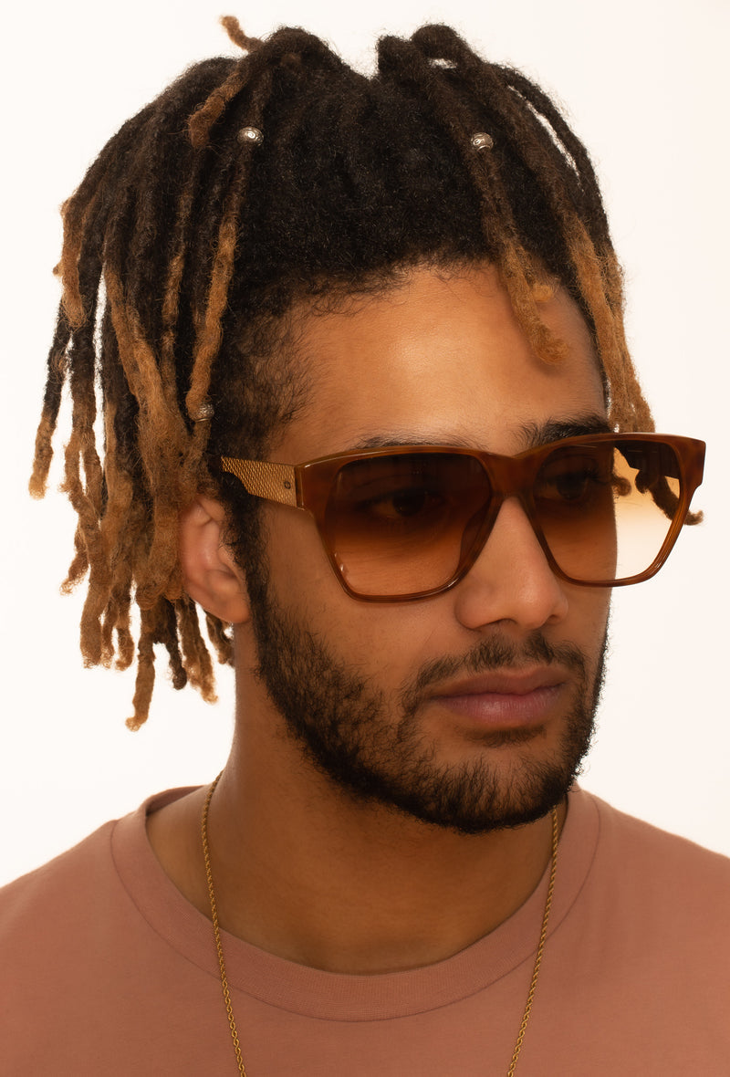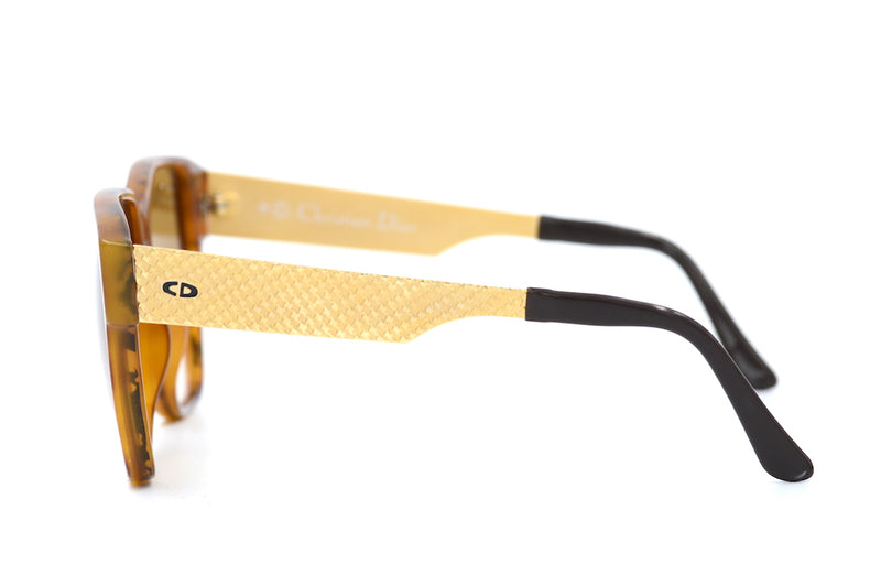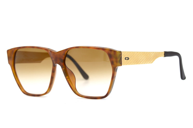 Christian Dior 2565 10 vintage sunglasses in colour 10. This 1970's pair of vintage sunglasses is super rare and was seen on Rhianna back in 2009. Broad gold textured temporals feature the Christian Dior emblem in black, whilst supporting the demi brown mottle front. A super cool oversized frame, new old stock. The lenses have a brown graduated tint and 100% UV protection. Manufactured in Germany.