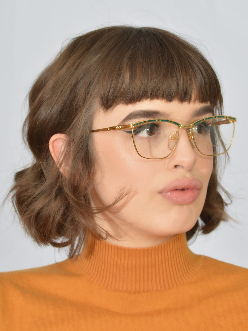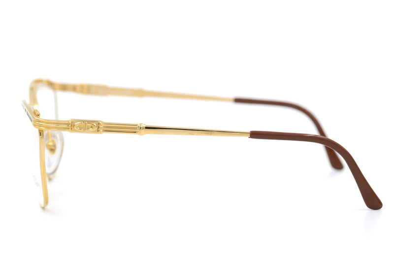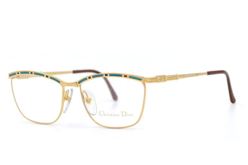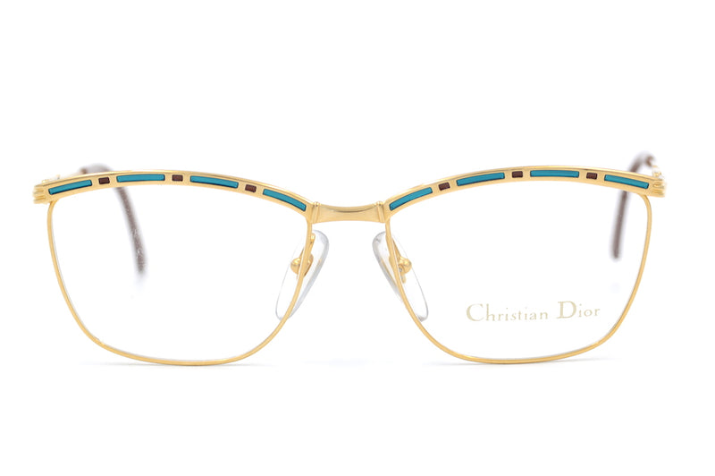 Christian Dior 2720 is a magnificent vintage glasses frame from the 1980's. This metal frame is new old stock and was manufactured in Austria. The colour model is 46, which is polished gold with turquoise and maroon detail to the brow. The temporal sides have the Christian Dior emblem. This rare Christian Dior frame is one to watch. Custom lenses available from only £29.00.