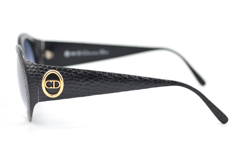 We absolutely love this classic 90s sunglasses frame by Dior. Christian Dior 2854 in colour 90. Oversized oval sunglasses, made of black acetate with a crocodile leather look finish. New unworn vintage stock. Grey graduated lenses provide UV protection. The timeless Christian Dior emblem is present on both temporal sides.