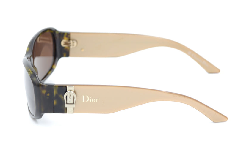 Manufactured in Italy, we have this fabulous Christian Dior Made 2 sunglasses frame. This brown wrap around acetate frame features broad temples, giving great peripheral coverage from the sun. The brown tortoiseshell front is softened with light temple sides, featuring the Dior signature, and belt buckle detailing. The frame is in excellent up-cycled condition showing little sign of wear. New brown lenses absorb 85% of light and have 100% UV protection. Suitable for Custom lenses.